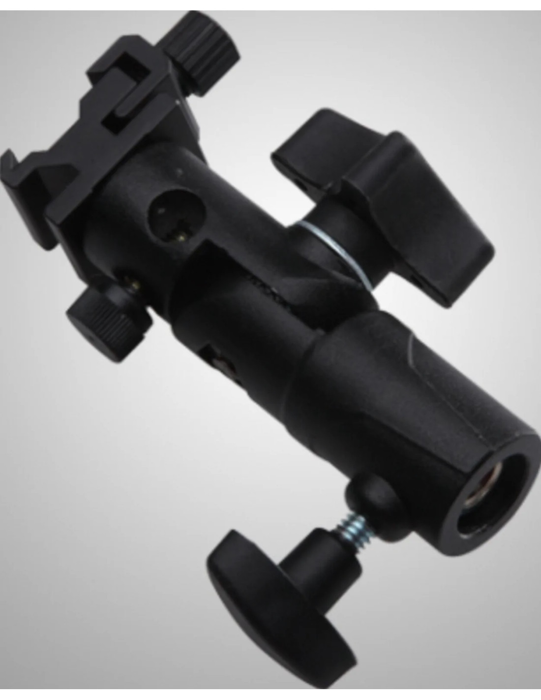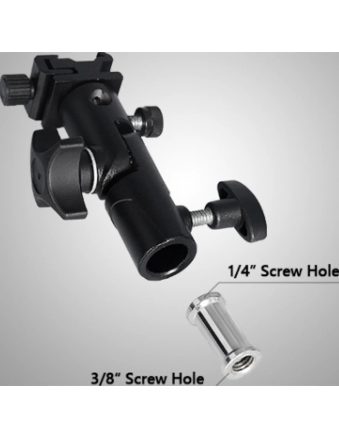 Questa staffa per flash consente allo speedlite di montare una fotocamera su una luce stroboscopica controllabile con capacità di rotazione e inclinazione complete. Quando viene utilizzato con l'ombrello da studio, lo speedlite produce una luce diffusa professionale. È compatibile con qualsiasi luce flash con attacco a slitta standard.