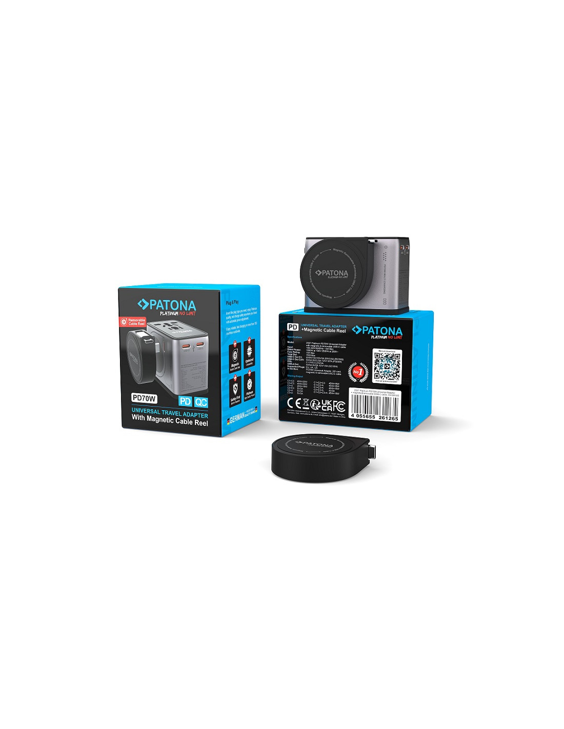PATONA ADATTATORE DA VIAGGIO UNIVERSALE PLATINUM PD70W CON AVVOLGICAVO MAGNETICO 3X USB-C - 1X USB-A