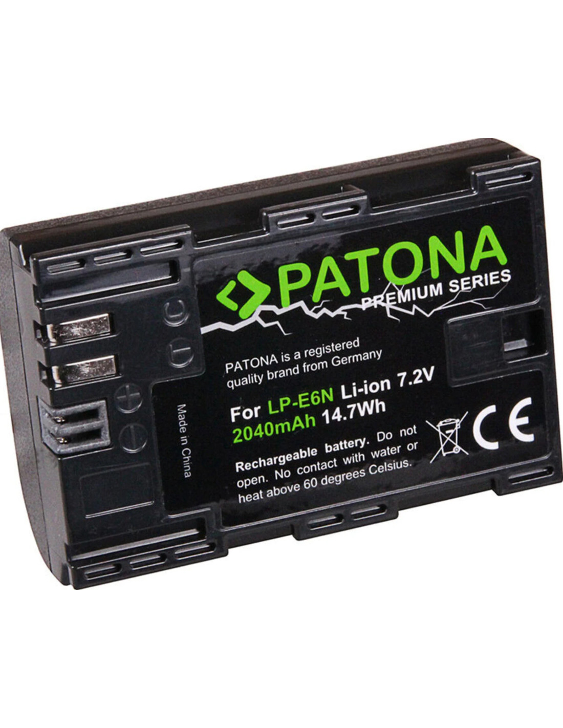 Batteria PATONA Premium per Canon LP-E6N LPE6N XC10 EOS 80D 90D 7D 70D 6D 60D, EOS R Dati tecnici: - Alta capacità 2040 mAh / 7,2 V / 14,7 Wh - Tipo: Li-ion - Marchio: PATONA Codice compatibile: Canon LP-E6, LPE6, LP-E6N, LPE6N Attenzione: verrà consegnata la versione LP-E6N Numero di modello compatibile: Canon EOS 5D, 5D Mark II, 5D Mark III, 5DS, 5DS R, 60D, 60Da, 6D, 70D, 7D, 7D, 7D Mark II, 80D, 90D, Mark II, Mark III, R 5D, XC10, EOS R