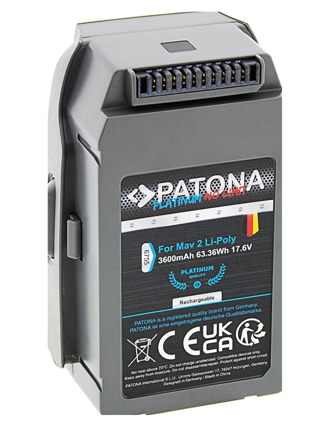 La serie PATONA Platinum è stata sviluppata per un piacere di volo sensazionalmente duraturo. Le prestazioni delle celle installate sono praticamente inesauribili. Nella serie PATONA Platinum sono state installate le celle più avanzate, caratterizzate da una qualità eccezionale e impressionante allo stesso tempo. La serie Platinum rappresenta la massima qualità, la maggiore durata e l'innovazione più avanzata di PATONA. Acquistando una batteria della serie PATONA Platinum, ottieni un prodotto eccellente e raffinato che ti affascinerà. 100% compatibile con le batterie originali DJI grazie alla forma su misura, che include protezione contro sovraccarichi e cortocircuiti.