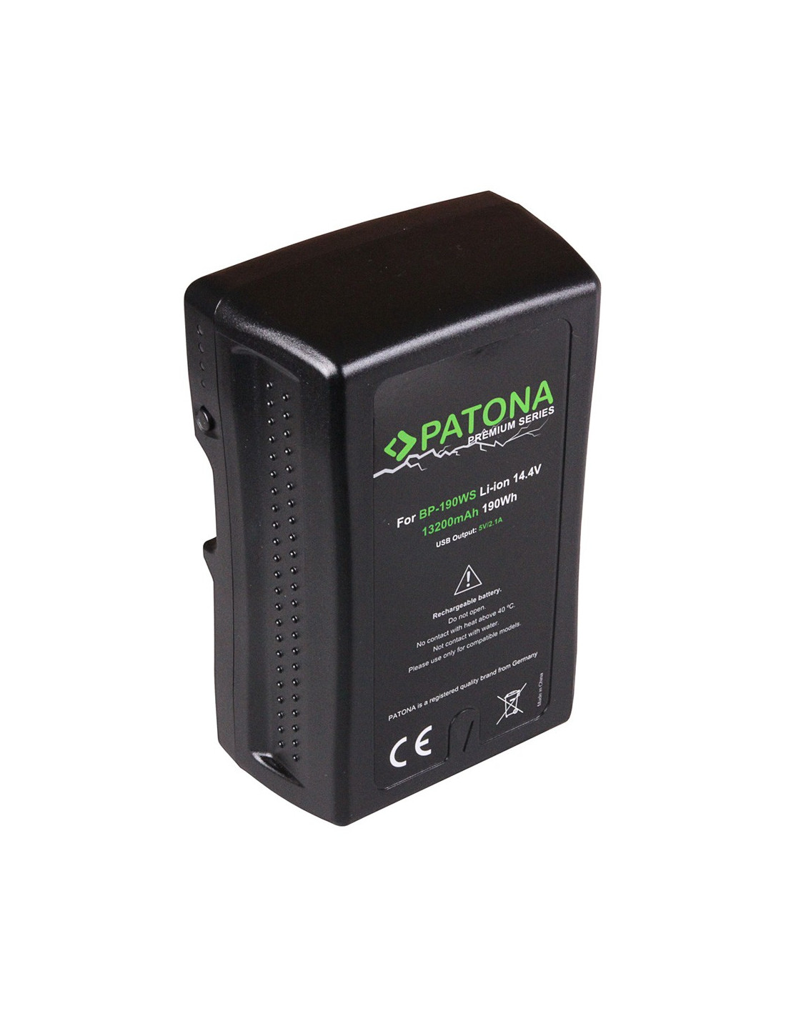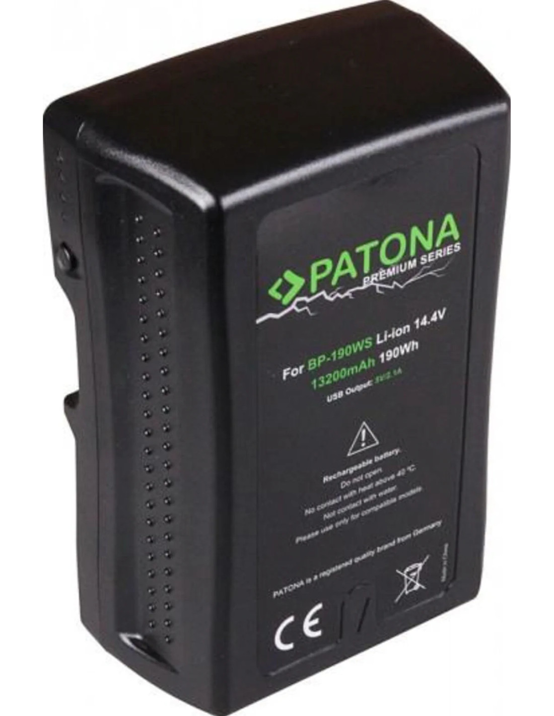 Batteria PATONA Premium V-Mount 190 Wh per Sony BP190WS DSR 250P 600P 650P 652P Dati tecnici: - Alta capacità 13200 mAh / 14,4 V / 190,1 Wh (potenza massima: 252 Wh) - Uscita USB: 5,0 V / 2,1 A. - Uscita D-Tap: 10V-16,8V - Tipo connettore: V-Mount - Tipo: Li-Ion - Numero di celle: 16 - Corrente massima: 15A - Peso: 1040gr - Dimensioni: 96x152x53mm - Marchio: PATONA Codice compatibile: Sony BP150w, BP-150w, BPGL65, BP-GL65, BPGL95, BP-GL95, BPGL95A, BP-GL95A Numero di modello compatibile: Sony DSR 250P, 600P, 650P, 652P HDW 800P PDW 850 DSR-250P, DSR-600P, DSR-650P, DSR-652P, HDW-800P, PDW-850