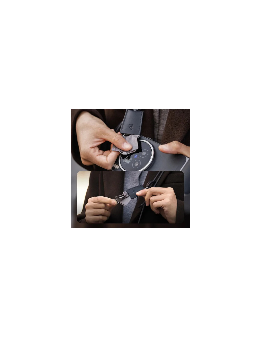 La borsa è dotata di una tracolla staccabile con un panno per la pulizia delle lenti comodamente attaccato per ritocchi rapidi. Una tasca nascosta consente di riporre l'AirTag in modo da poter recuperare la borsa in caso di smarrimento o furto.