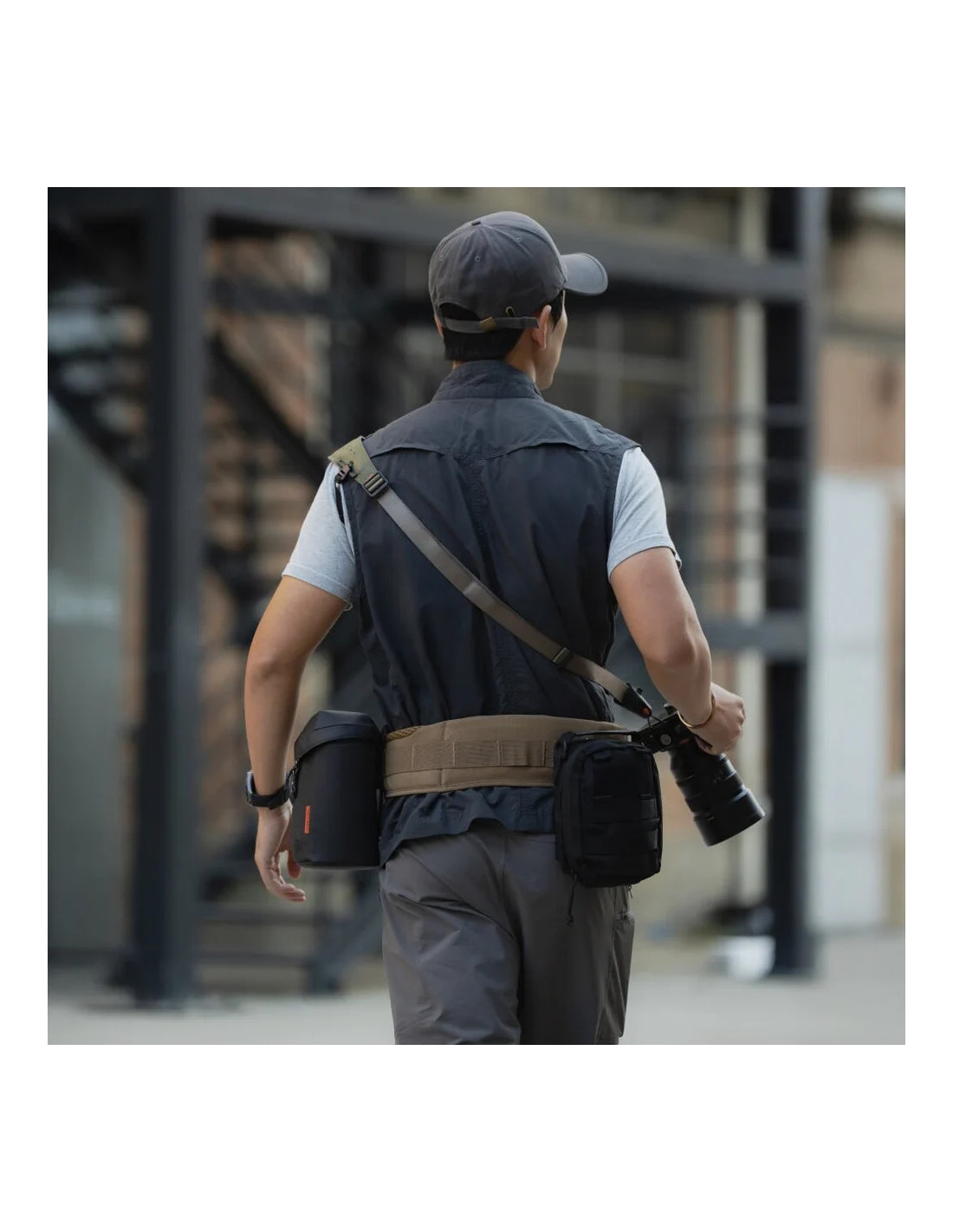 La cintura fotografica OneMo di PGYtech è dotata di diversi punti di aggancio per montare clip a sgancio rapido per fotocamere, custodie per obiettivi, treppiedi, borse per accessori e altro ancora. Una cinghia di sicurezza sul lato destro mantiene la fotocamera al suo posto e impedisce che oscilli quando sei in movimento. Questa versatile cintura può essere indossata da sola o agganciata allo zaino.