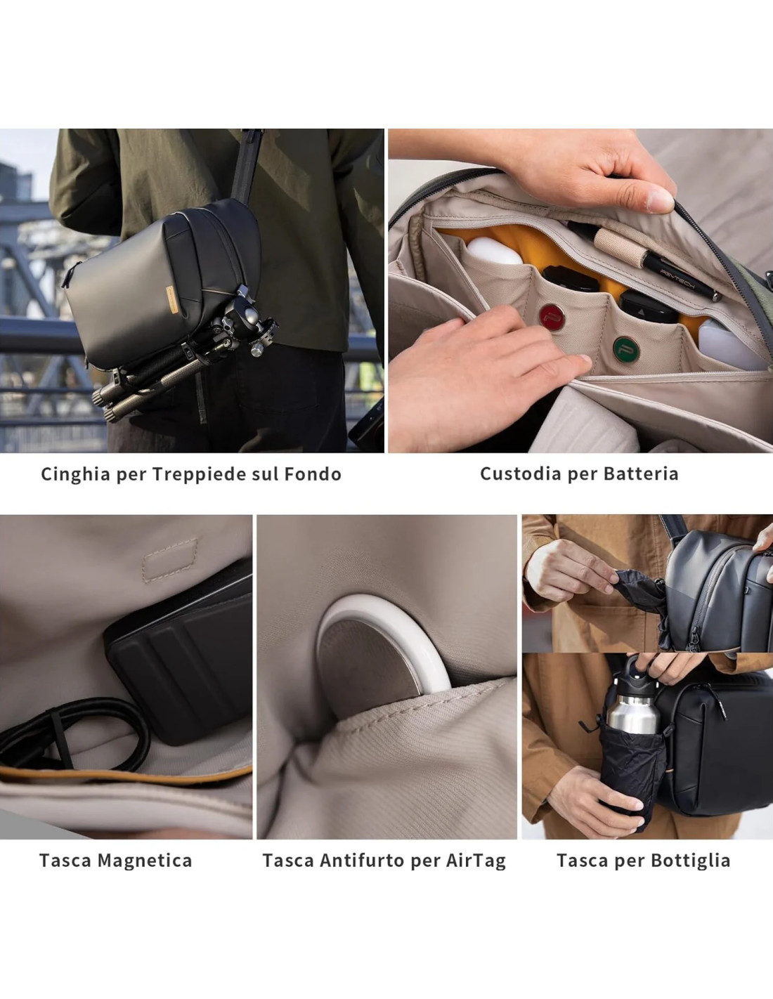 La OneGo Solo V2 da 6L di PGYTECH, color ossidiana, è una borsa a tracolla elegante e funzionale, progettata per contenere una fotocamera e due obiettivi nello scomparto principale. Uno scomparto dedicato può ospitare un iPad Pro da 11". Dispone di più tasche di diverse dimensioni per una varietà di oggetti, tra cui batterie, mouse per computer, filtri, cavi, dischi rigidi, power bank e altro ancora. Il divisorio interno in un unico pezzo incluso aiuta a tenere gli oggetti separati e facili da trovare. Lo scomparto anteriore è ideale per riporre il telefono, le carte e le chiavi per un accesso rapido. La tracolla è dotata di una spessa e ampia imbottitura in EVA e di una fibbia a regolazione rapida per una vestibilità perfetta. Le cinghie sul fondo dell'imbragatura sono adatte a contenere un treppiede o altri attrezzi ingombranti.
