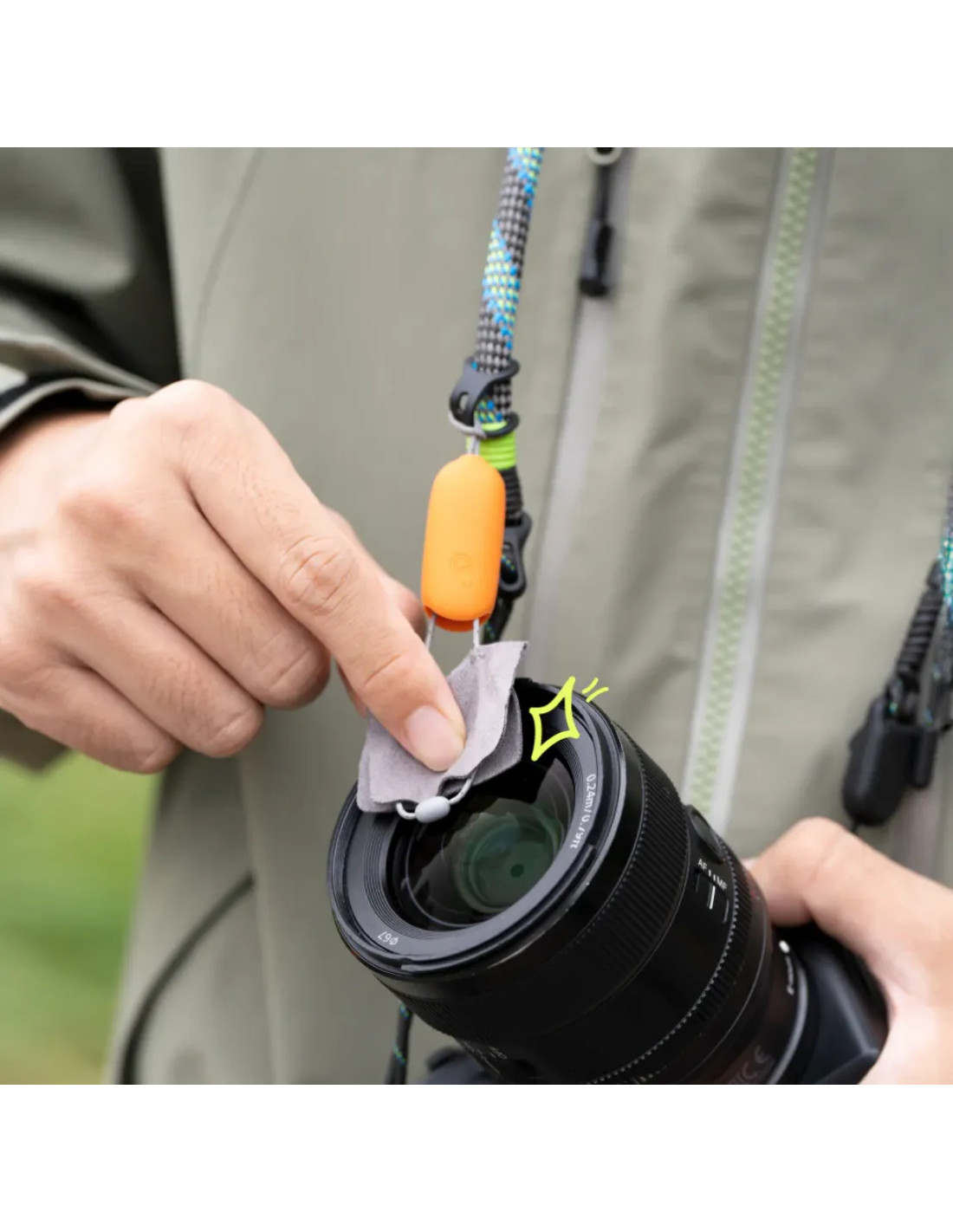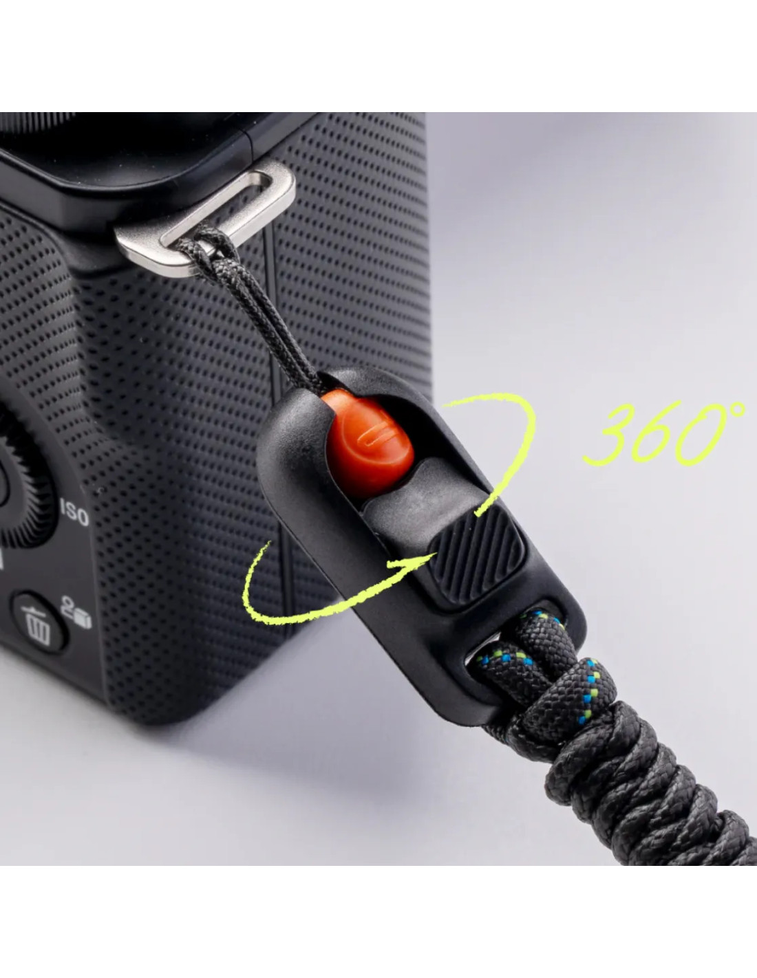 Piccoli oggetti come copriobiettivo o chiavi possono essere fissati al cordino della tracolla per un accesso flessibile all'aperto e una conservazione senza problemi.