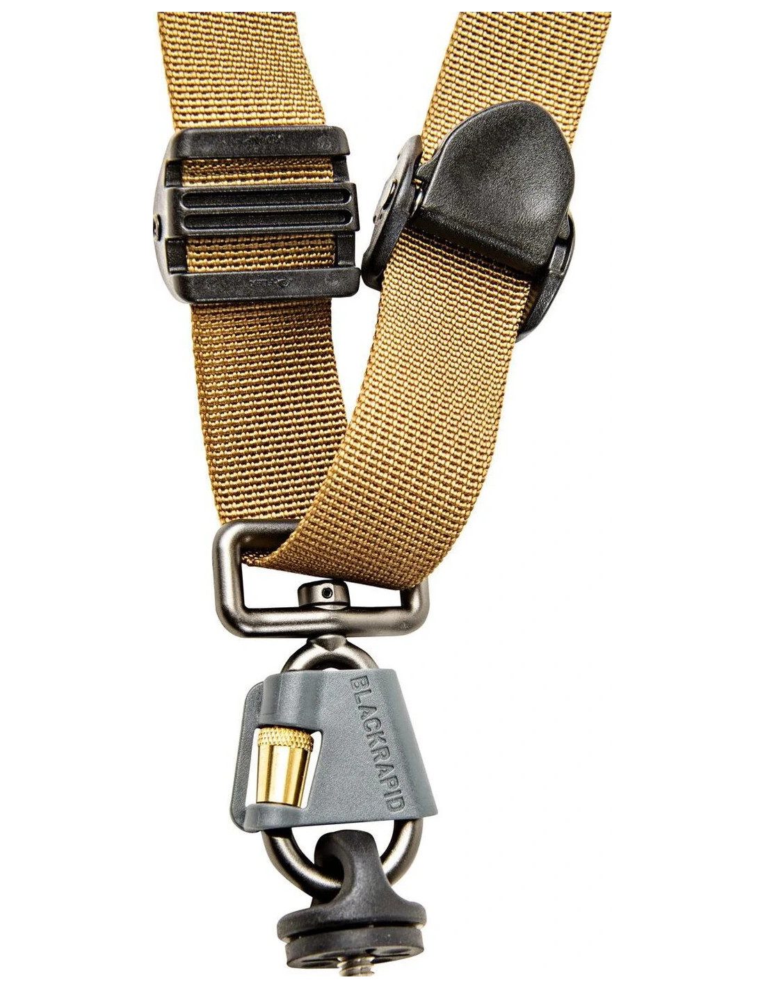 - I lucchetti a camme scorrevoli anteriori e posteriori sulla cinghia fissano la fotocamera in posizione sull'anca.