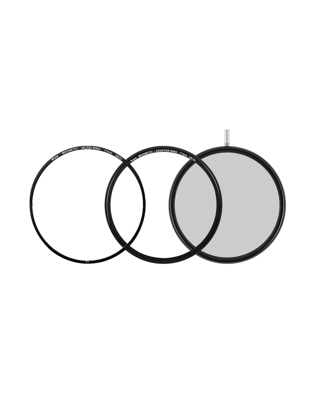 Il filtro viene fornito con un anello adattatore magnetico e un anello di inserimento Kase Revolution. L'adattatore magnetico (o l'anello di inserimento) viene avvitato nel filetto dell'ottica ed è compatibile con obiettivi con filetto da 77mm. (Sono disponibili anelli magnetici di adattamento per altri diametri sotto la pagina.) L'anello di inserimento magnetico Kase Revolution (anello inserito magneticamente) può essere utilizzato al posto dell'adattatore ed essere avvitato nel filetto dell'obiettivo (82mm). Un vantaggio dell'anello di inserimento magnetico è che non ingombra (quindi minor rischio di vignettatura), poiché il filtro o i filtri si avvicinano considerevolmente all'obiettivo.