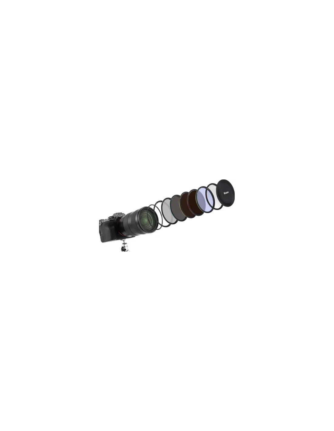 - Ci sono diversi modi per avvitare l'adattatore intarsiato ultrasottile. Il modo principale è quello di collegarlo magneticamente a uno dei filtri ND inclusi e di avvitarli entrambi a mano. Quindi è possibile rimuovere il filtro o sovrapporne altri. È inoltre possibile collegare il paraluce magnetico opzionale Kase.