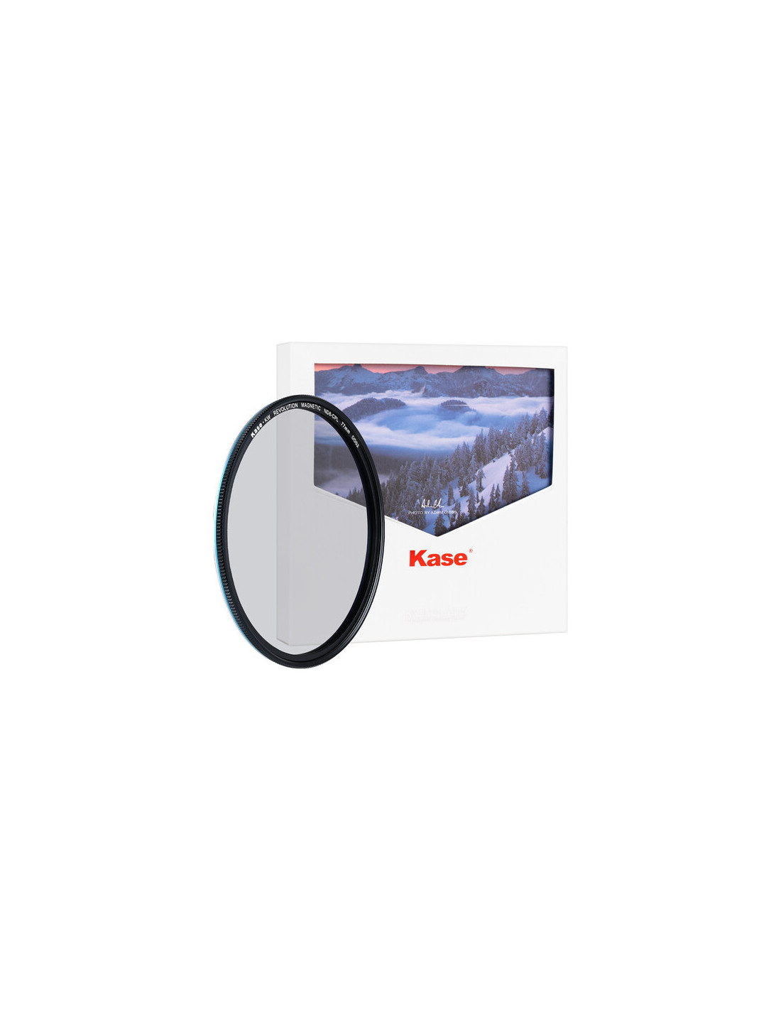 Il filtro KW Revolution ND8/CPL da 77 mm con banda blu e argento di Kase è codificato a colori, in modo da poterlo distinguere facilmente dagli altri filtri ND/CPL della serie KW Revolution. Insieme al filtro è incluso un anello adattatore magnetico da 77 mm che si avvita agli obiettivi con filettatura da 77 mm. È possibile impilare magneticamente fino a quattro filtri KW Revolution, compreso l'ND/CPL. Il filtro ND/CPL è realizzato in vetro ottico temperato antiurto ed è impermeabile.