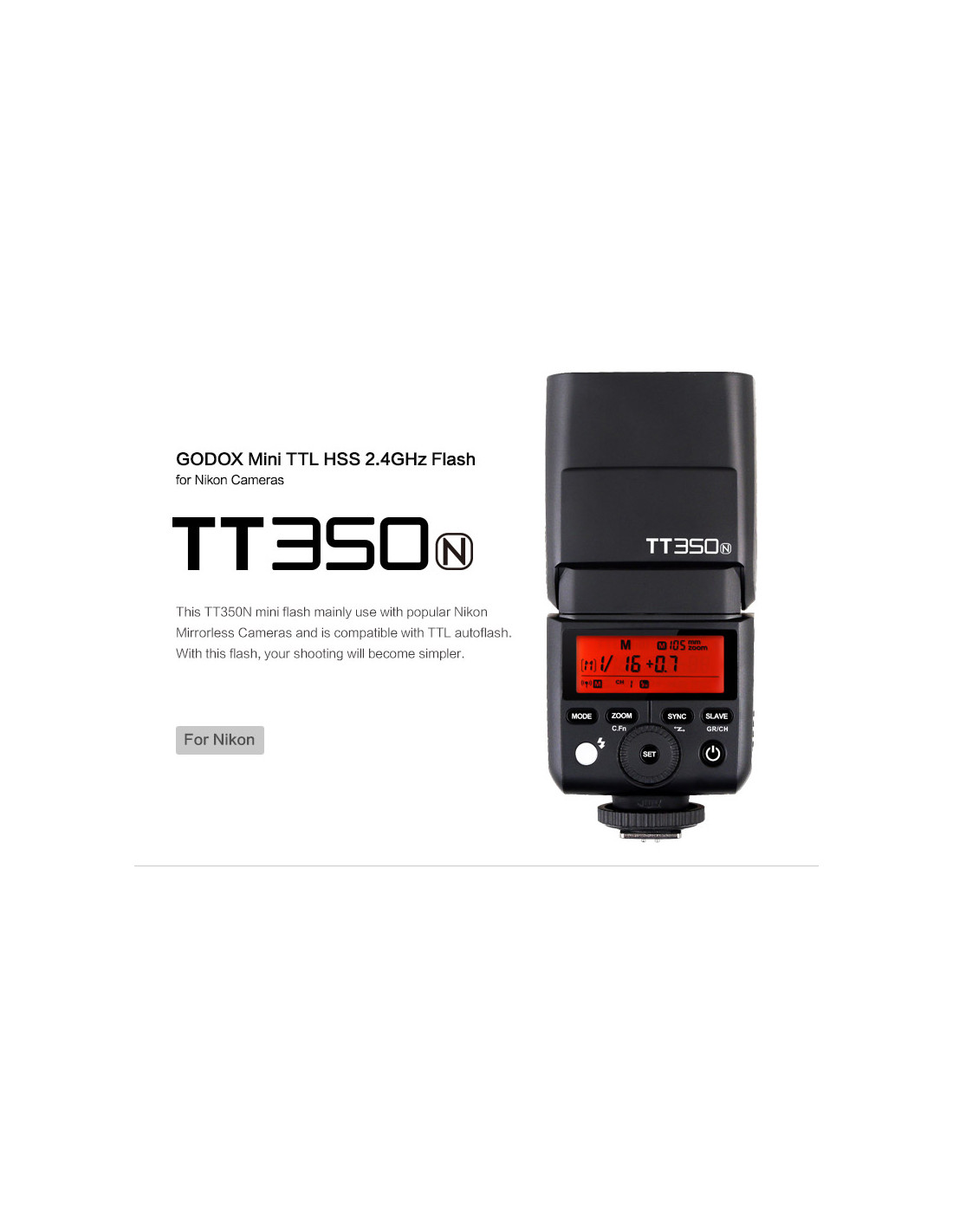 Godox - Speedlite Camera Flash per Nikon TT350 TTL Godox TT350 è un mini flash TTL con supporto wireless 2,4GHz.