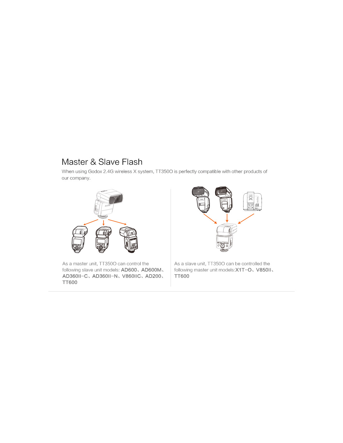- Può funzionare come Master o Slave in configurazioni con altri flash Godox (vedi grafico)
