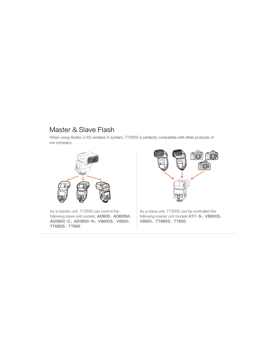 - Può funzionare come Master o Slave in configurazioni con altri flash Godox (vedi grafico)