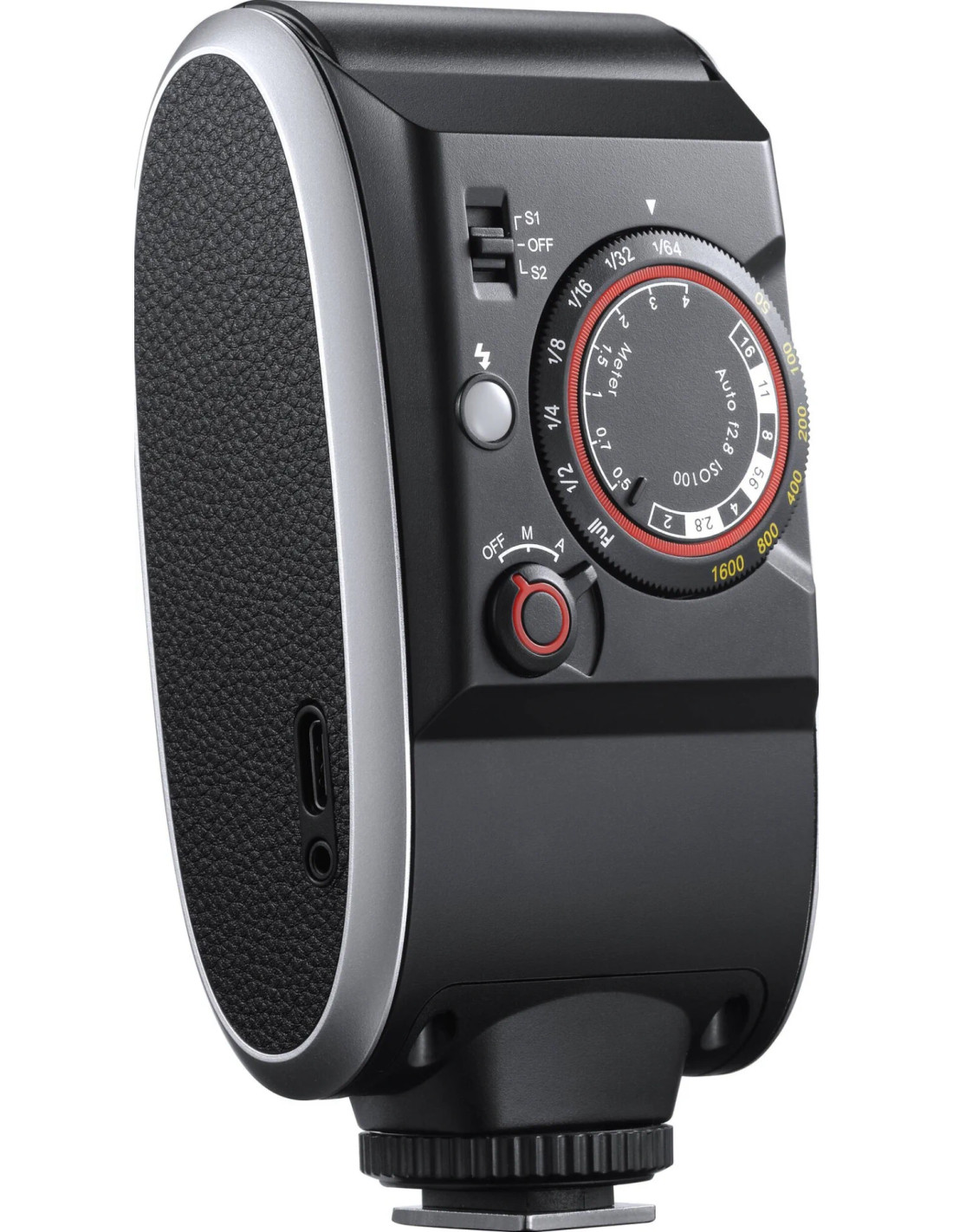 Chiamato flash "retro", l'unità ha un quadrante semplice che correla ISO con aperture, livelli di potenza e distanze di ripresa. Ad esempio, se vuoi scattare a 5' con un ISO di 400, la ghiera allinea f/5.6 e 1/16 di potenza. Il flash ha anche una modalità automatica, che per impostazione predefinita è f/2.8 a ISO 100.