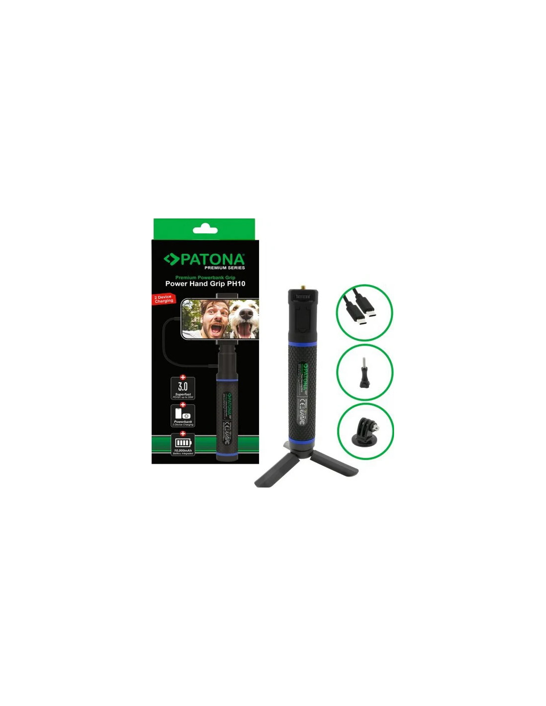 PATONA Premium Grip Power Hand PH10 con Power Bank - la combinazione perfetta di impugnatura, monopiede e fonte di energia portatile. Progettato per le videocamere d'azione come la GoPro, il PH10 non solo garantisce una presa sicura durante le riprese, ma dispone anche di un power bank integrato da 10.000 mAh, ideale per le lunghe sessioni di ripresa in movimento. Che si tratti di sport, viaggi o vlogging, con PH10 Grip Power Hand si è indipendenti dalla prossima presa di corrente.