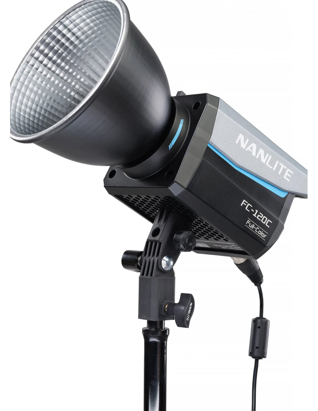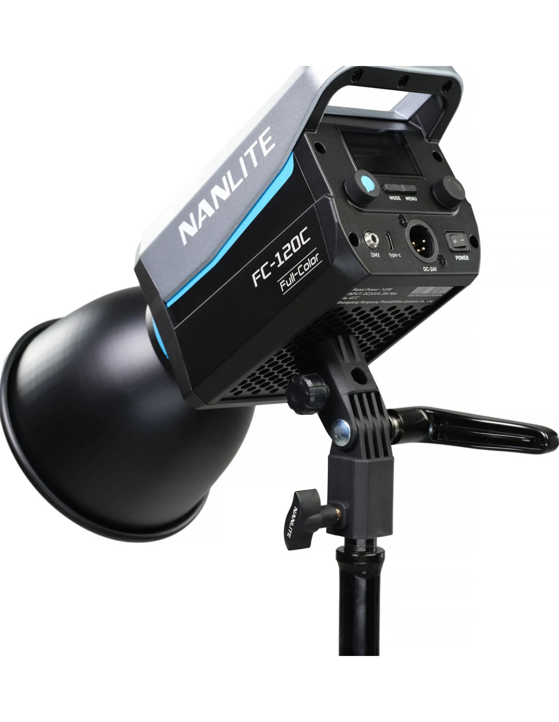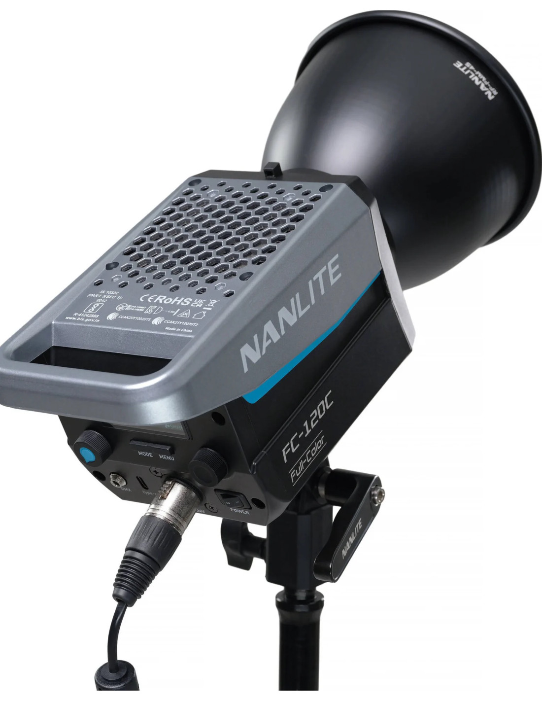 Utilizzando un attacco FM proprietario per modificatori di luce, l'FC120C è compatibile con una selezione di modificatori di luce Nanlite, come diversi tipi di softbox, una lente Fresnel FL-11 opzionale o un attacco per proiezione. L'apparecchio comprende anche un adattatore Bowens con portaombrelli integrato per una maggiore compatibilità con un vasto numero di modificatori di luce opzionali.