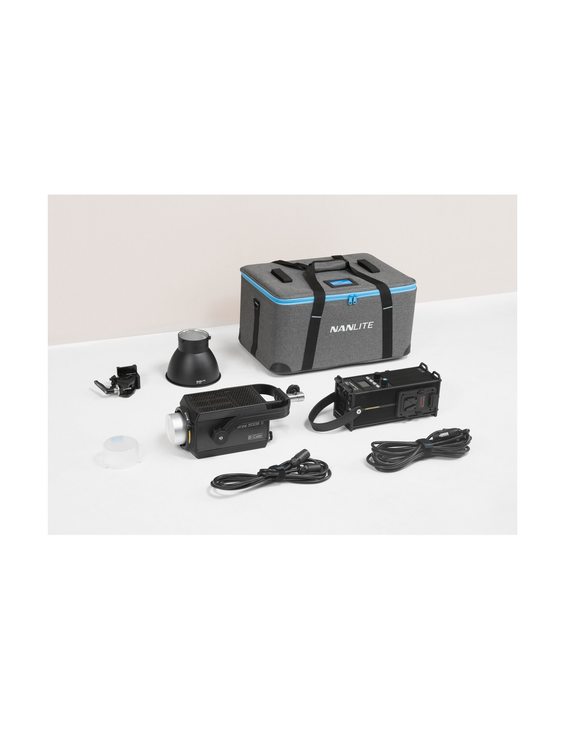L'unità di controllo è straordinariamente compatta e funziona senza ventola. La regolazione della luminosità avviene con incrementi dello 0,1% per regolare con precisione l'intensità. I cavi in dotazione sono di lunghezza generosa: 6 m per il cavo di alimentazione, 3 m per il cavo della testa, e separatamente sono disponibili cavi molto più lunghi. Il Forza 500B II è compatibile con un gran numero di modificatori di luce con attacco Bowens, compresi quelli offerti da Nanlite. È incluso un utile riflettore da 55° e sono disponibili numerosi altri modificatori, come l'FL-20G Fresnel con porte metalliche (venduto separatamente), che aumenta notevolmente la resa.