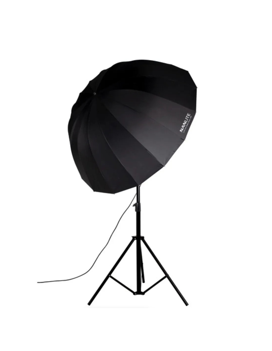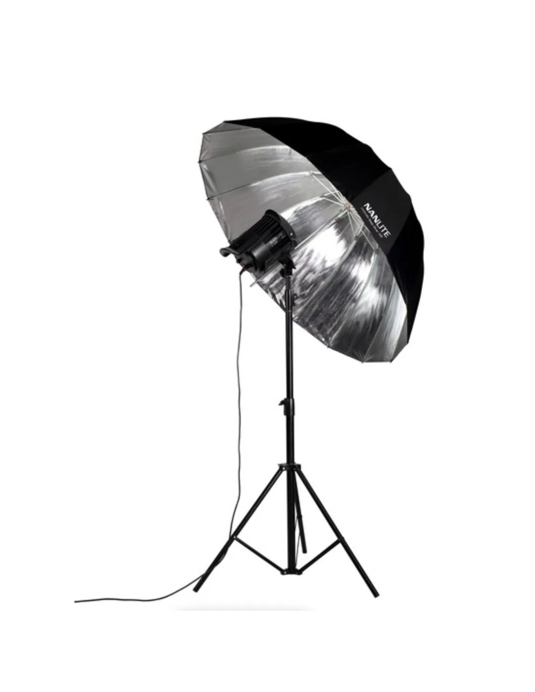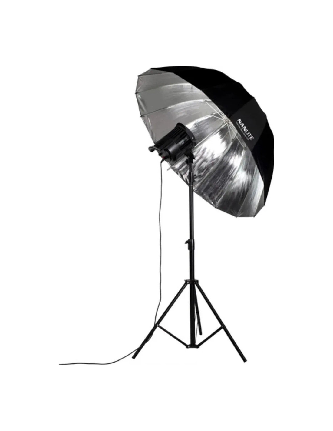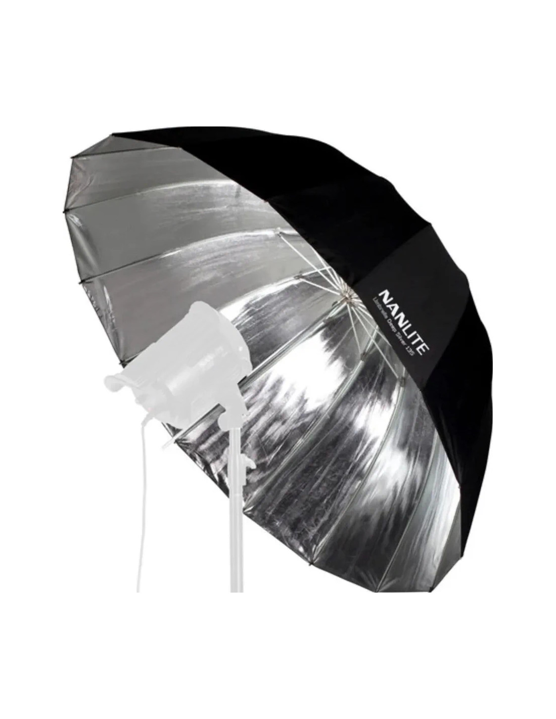 L'interno argentato del NanLite Silver Deep Umbrella 135 massimizza l'emissione, creando una luce contrastata con dettagli nitidi, mentre il suo design a 16 aste mantiene la forma rigida per una diffusione uniforme della luce.