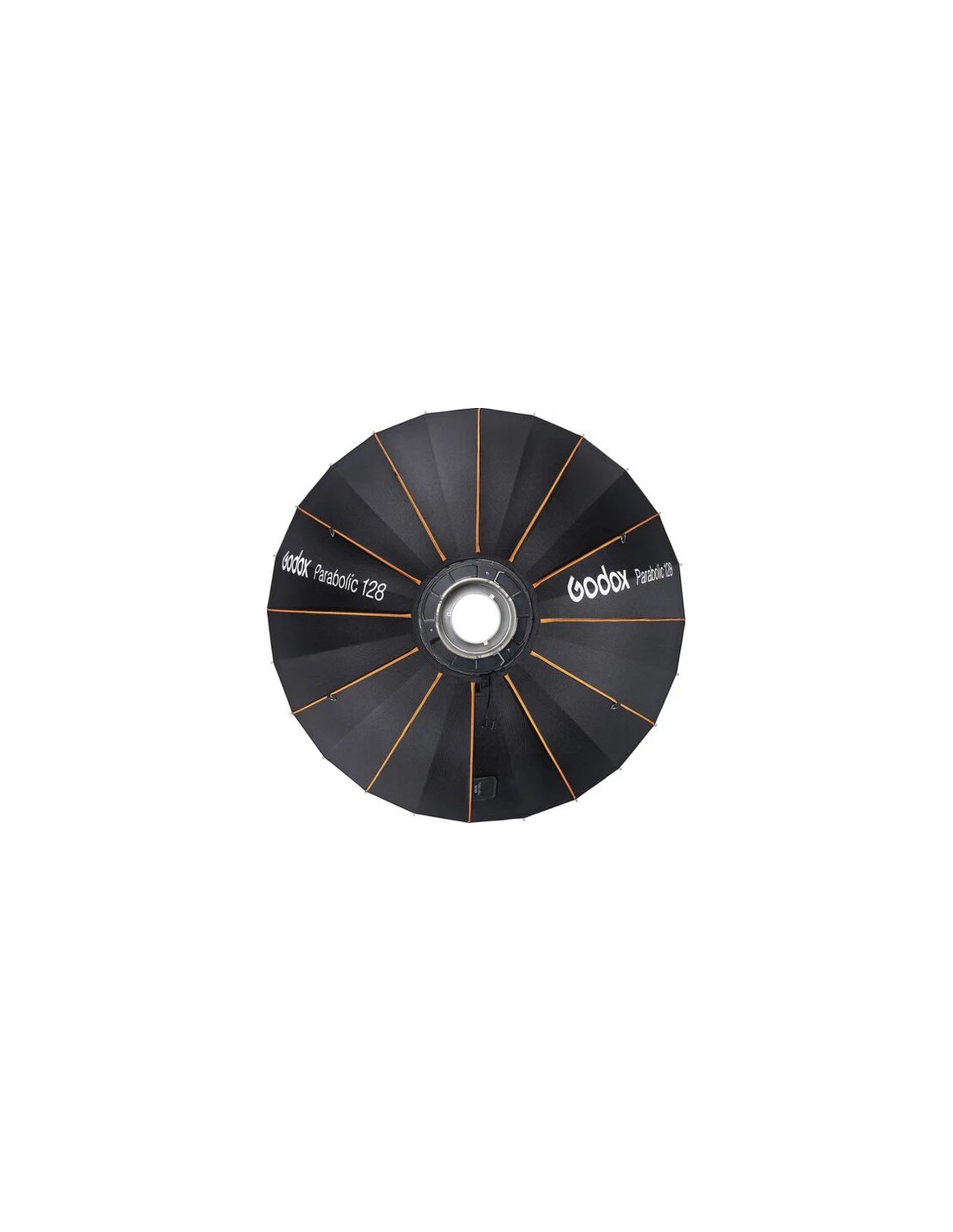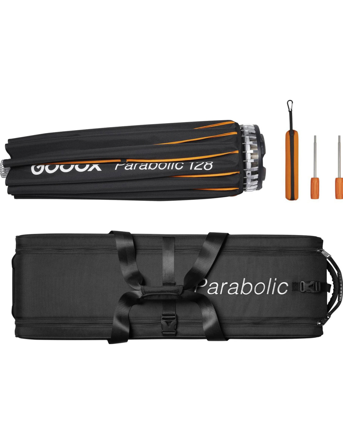 Progettato per fotografi di moda e ritrattisti, il kit riflettore Parabolic 128 di Godox offre luci nitide e speculari fornendo allo stesso tempo un'ampia fonte di luce che avvolge il soggetto. Il riflettore presenta un interno argento altamente riflettente con un diametro esterno di 47,2". Oltre al grande riflettore, questo kit include un supporto di messa a fuoco PF-M, un'asta di messa a fuoco PF-R870, un adattatore stroboscopico PF-BM, un kit impugnatura PB-G1, e una borsa per il trasporto CB35.