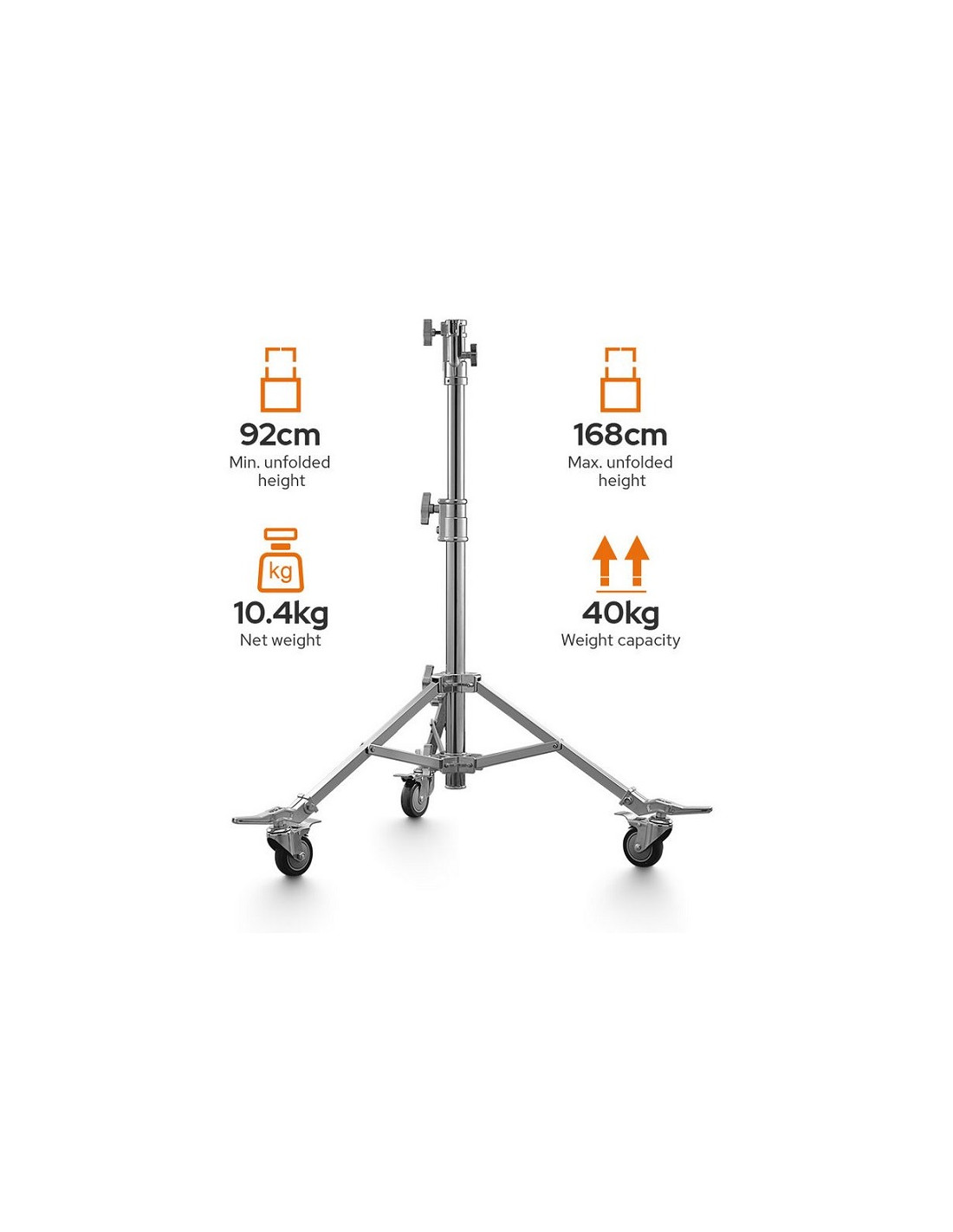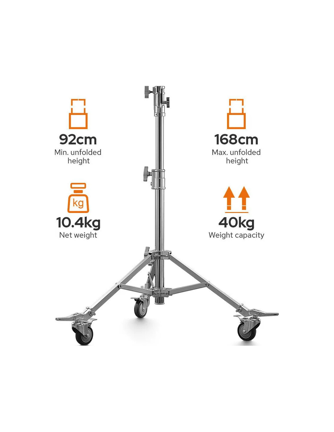 L'SA5015 con base pieghevole e ruote è uno stativo a rulli in acciaio può sostenere fino a 40 kg. Con il suo materiale solido e il suo design affidabile, ti offre un'eccellente stabilità. L'altezza dello stativo varia da 92cm a 168cm. Il supporto ha una gamba regolabile che può estendersi per livellarlo su terreni irregolari, su scale o in spazi ristretti. Ha un ricevitore junior da 1-1/8" e un perno retrattile da 5/8" che può essere ruotato di 90° per consentire di montare l'ingranaggio verticalmente o orizzontalmente.