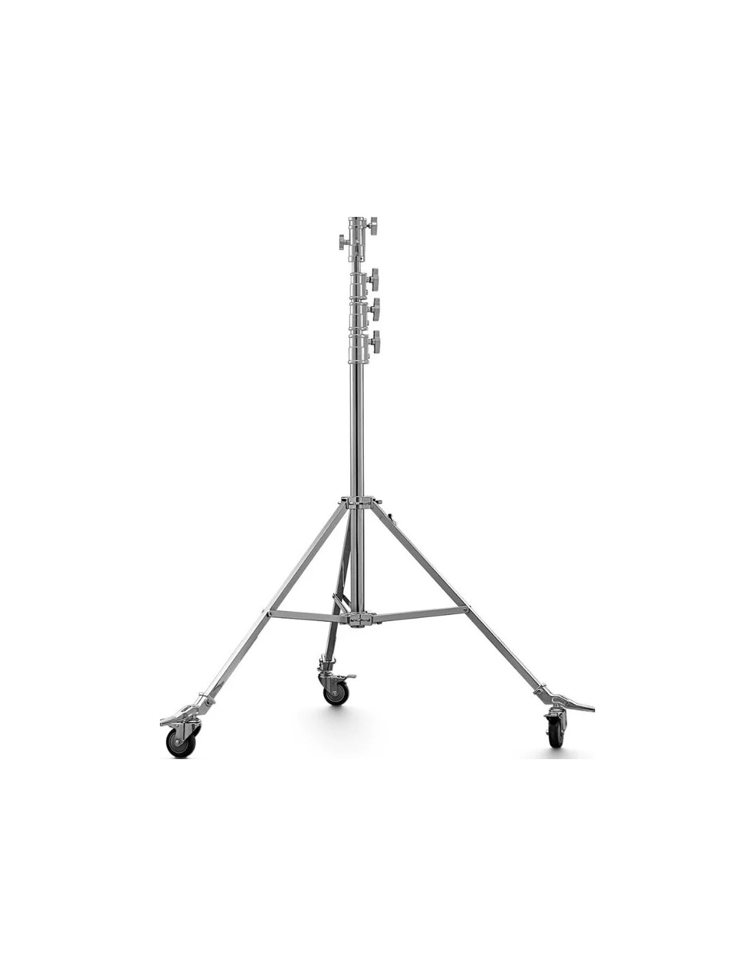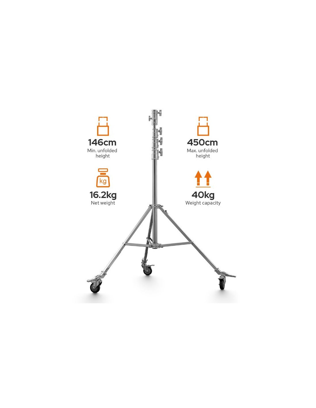 L'SA5045 è uno stativo a rulli in acciaio per impieghi gravosi che può supportare fino a 40 kg e presenta una base pieghevole e ruote. Offre una superba stabilità grazie alla sua costruzione robusta e al design solido. L'altezza aperta del supporto varia da 146cm a 450cm. Con una gamba regolabile, il supporto può estendersi per livellarlo su terreni irregolari, sulle scale o in spazi ristretti. Nello stativo sono presenti un ricevitore junior da 1-1/8" e un perno retrattile da 5/8" che può essere ruotato di 90° per consentire il montaggio dell'attrezzatura in verticale o in orizzontale.