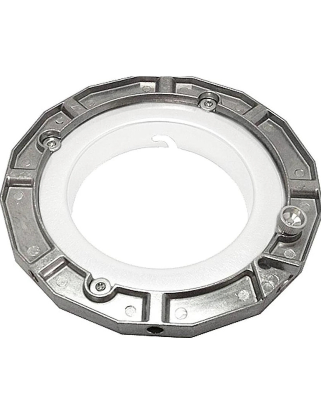 Dotato di 4 viti di fissaggio, che permettono anche la rotazione della flangia, per poter posizionare il softbox all'angololazione desiderata;