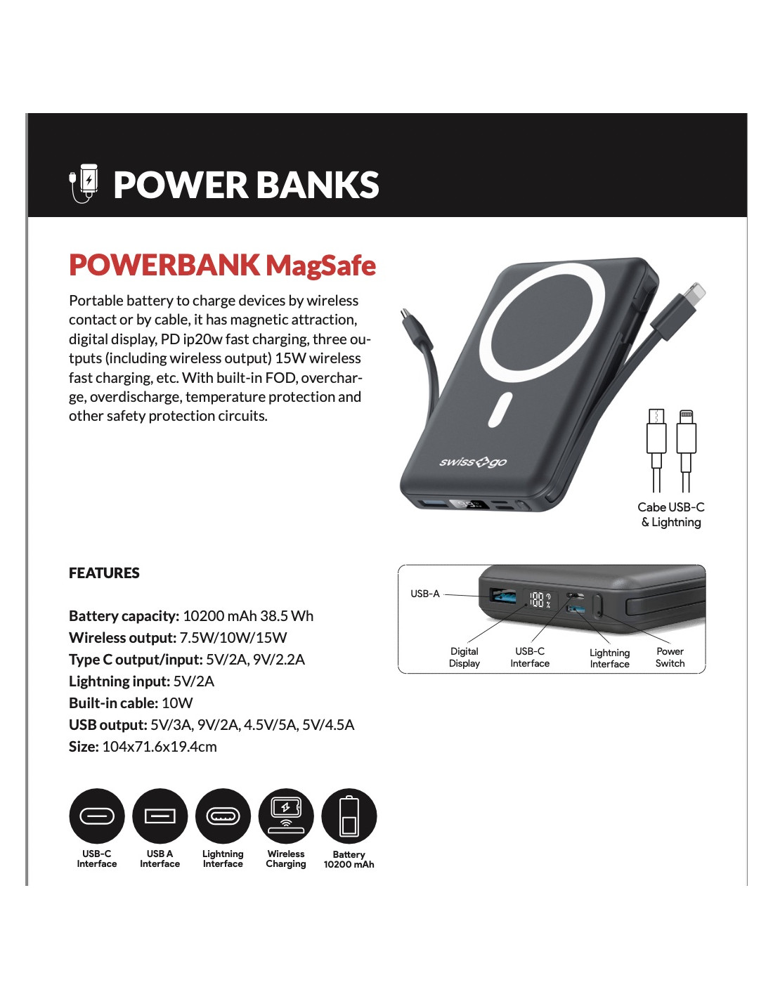 SWISS+GO POWER BANK MAGSAFE 10200mAh FAST CHARGE USB-C WIRELESS LIGTNING