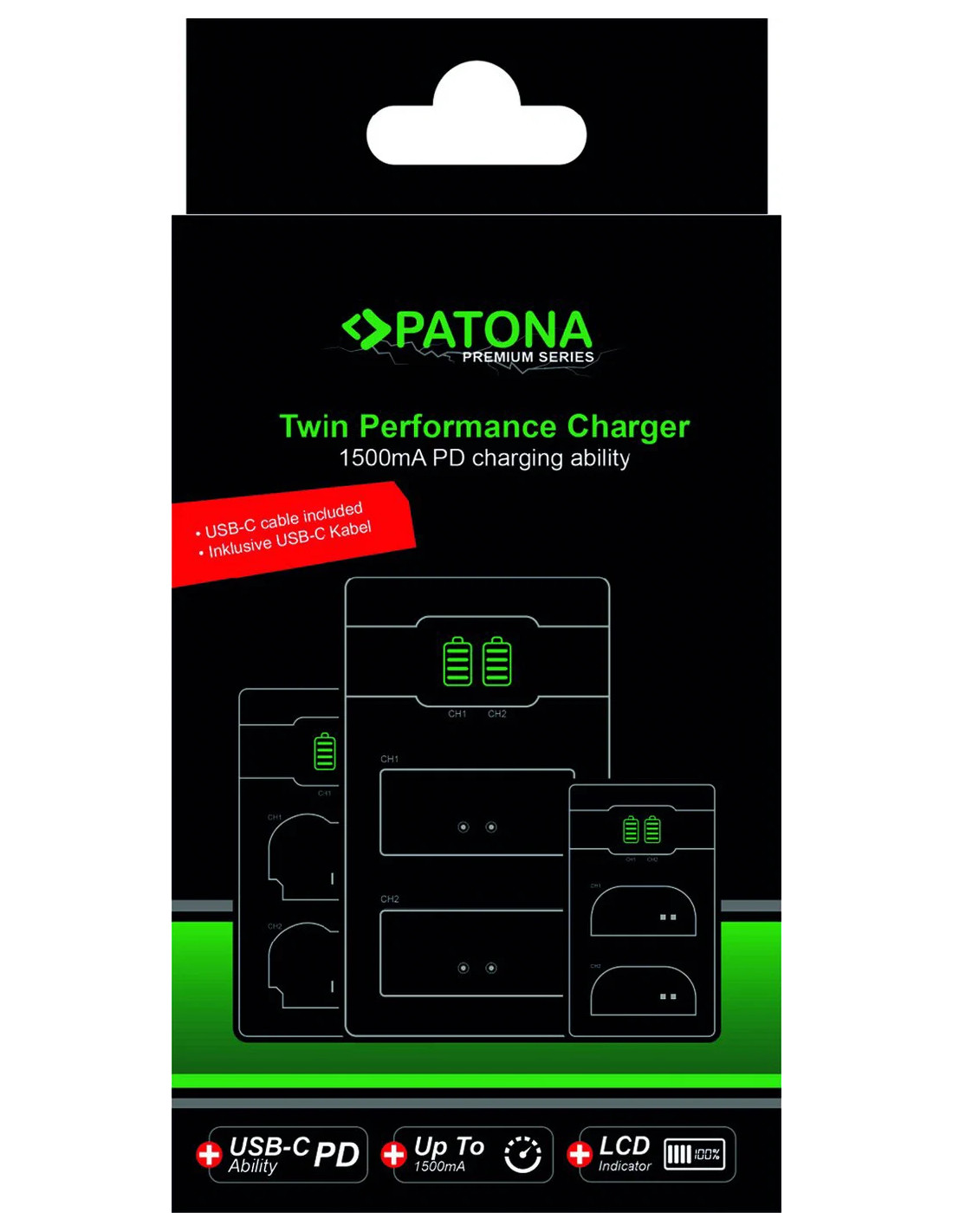 Il caricabatterie è collegato alla fonte di alimentazione tramite la porta USB-C. Si consiglia l'adattatore PATONA Premium PD 20W (vedere la scheda inferiore "Accessori"). Si noti che la velocità di ricarica completa si ottiene solo con un caricatore PD da 20W.