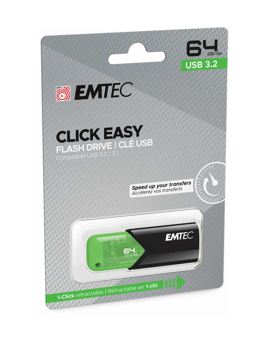 Emtec Click Easy. Capacità: 64 GB, Interfaccia dispositivo: USB tipo A, Versione USB: 3.2 Gen 1 (3.1 Gen 1). Fattore di forma: Senza coperchio, Colore del prodotto: Nero, Verde